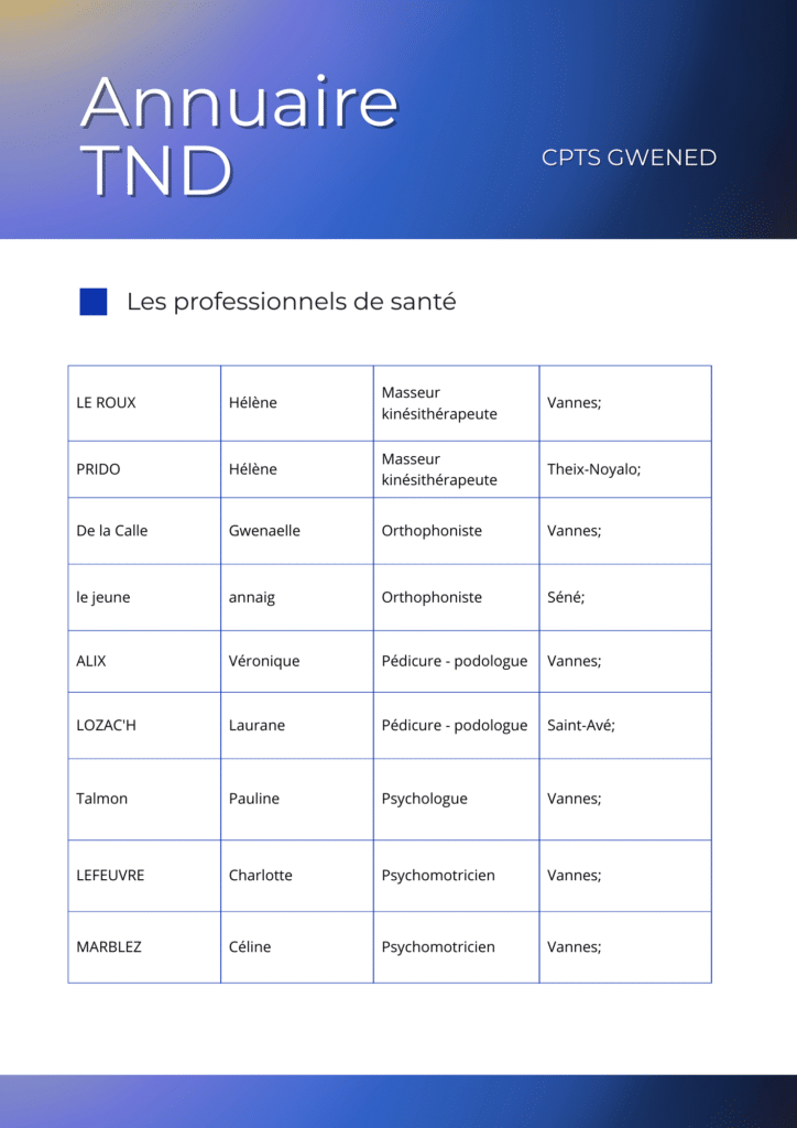 Le groupe TND de la CPTS GWENED travaille à faciliter la démarche diagnostique et de prise en soin interdisciplinaire des enfants concernés sur le territoire. Afin de faciliter la communication entre professionnels et l’orientation des patients, nous vous proposons d’apparaître sur le répertoire TND. Adhésion non obligatoire.